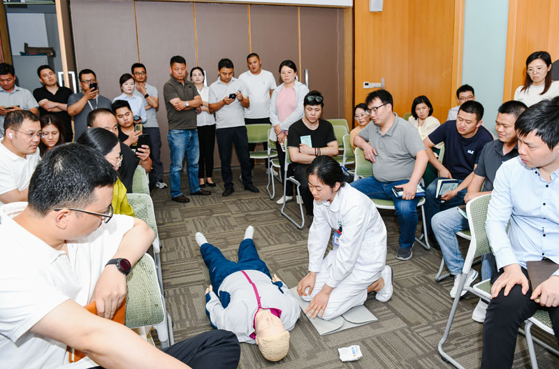 在第一階段活動現(xiàn)場,醫(yī)護人員通過PPT的形式,為大家詳細(xì)講解了心肺復(fù)蘇、AED使用、海姆立克急救法的操作要點和注意事項,以及夏季高溫中暑的自救互救應(yīng)急處理知識,并通過互動方式一對一指導(dǎo)教學(xué),鍛煉了實際操作能力。隨后,醫(yī)護人員也為在場職工進行血壓、血糖等項目測量,中醫(yī)把脈問診、家庭醫(yī)生簽約等便民服務(wù),參加此次活動的職工紛紛表示受益匪淺。